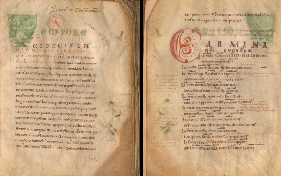 这本书写于 11 世纪。第一对开本背面饰有钢笔画,描绘了其他手稿中经常出现的场景:哲学以女性形象出现,探望和慰问博提乌在狱中。